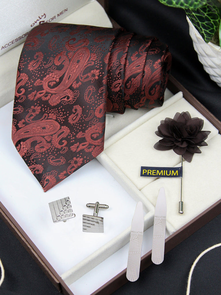 Buy this Brown colored Paisley 4-piece tie gift set for men/ cufflink gift set for men presented to you by the house of Peluche. The Peluche neck tie and cufflink set for men is a remarkable ensemble that exudes style and sophistication. This tie set for men includes a dapper necktie, a cufflink and brooch combo, and a collar stay. The necktie is designed to impress, featuring a sleek and modern pattern that adds a touch of charm to any outfit. The brooch is a stunning accessory, perfect for adding a dash of glamour to formal occasions. The cufflinks, with their exquisite design, lend a polished and refined look. And with the collar stay, you can ensure a neat and tidy appearance. This men’s necktie and cufflink gift set is an impeccable choice for anyone who appreciates fine craftsmanship and timeless elegance.