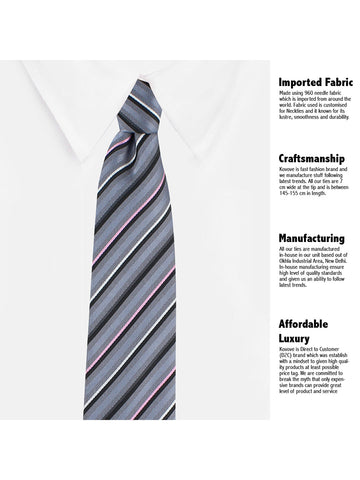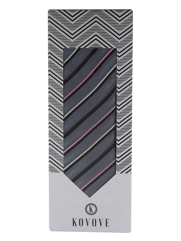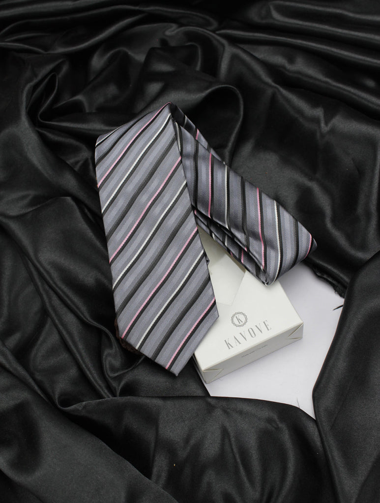 Buy this Grey colored Striped necktie for men from Kavove, a must-have accessory for the modern gentleman. Crafted with care and attention to detail, this necktie combines style and sophistication. Made from high-quality materials, it offers a smooth and comfortable feel. The versatile design of the necktie by Kavove ensures it complements both formal and casual attire, adding a touch of elegance to any outfit. With its easy-to-use and adjustable length, it provides a perfect fit for every wearer. Elevate your fashion game and make a lasting impression with this neck tie for men by Kavove. Upgrade your wardrobe with this timeless accessory and exude confidence and style.