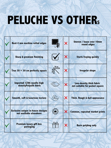 Package Content: WHAT YOU GET: 1) One (1) Pocket Square as shown in the pictures, 2) Chic Storage Box, 3) Care and Instruction guide and 4) Peluche Trust |
